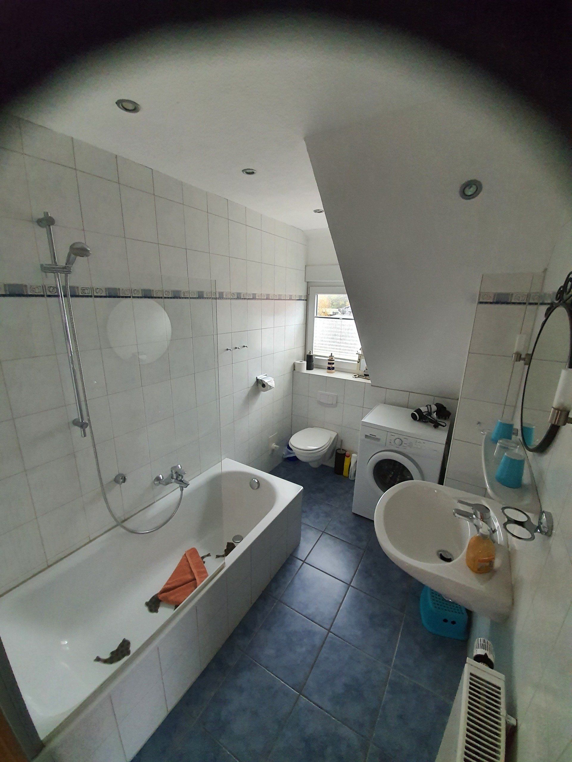 - Vom Flur aus gelangt man ins Tageslichtbadezimmer. Es verfügt über eine Duschwanne und ein WC. Im Badezimmer finden Sie auch eine Waschmaschiene zum Gebrauch.