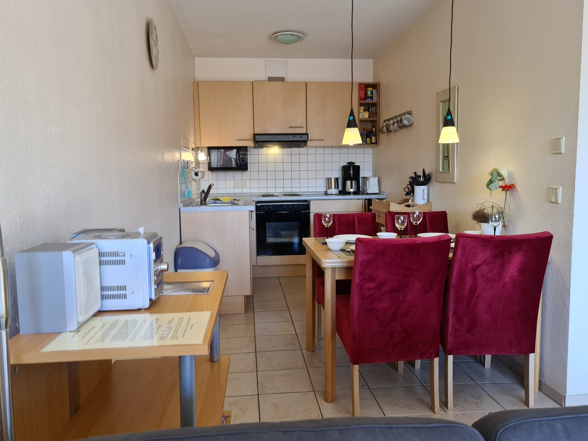 ist, wie in allen anderen Wohnungen, selbstverständlich mit allem ausgestattet, was den Urlaub angenehm macht. Spülmaschine, Eisfach, Mikrowelle, Wasserkocher,etc. Am Esstisch finden vier Personen ihren Platz.